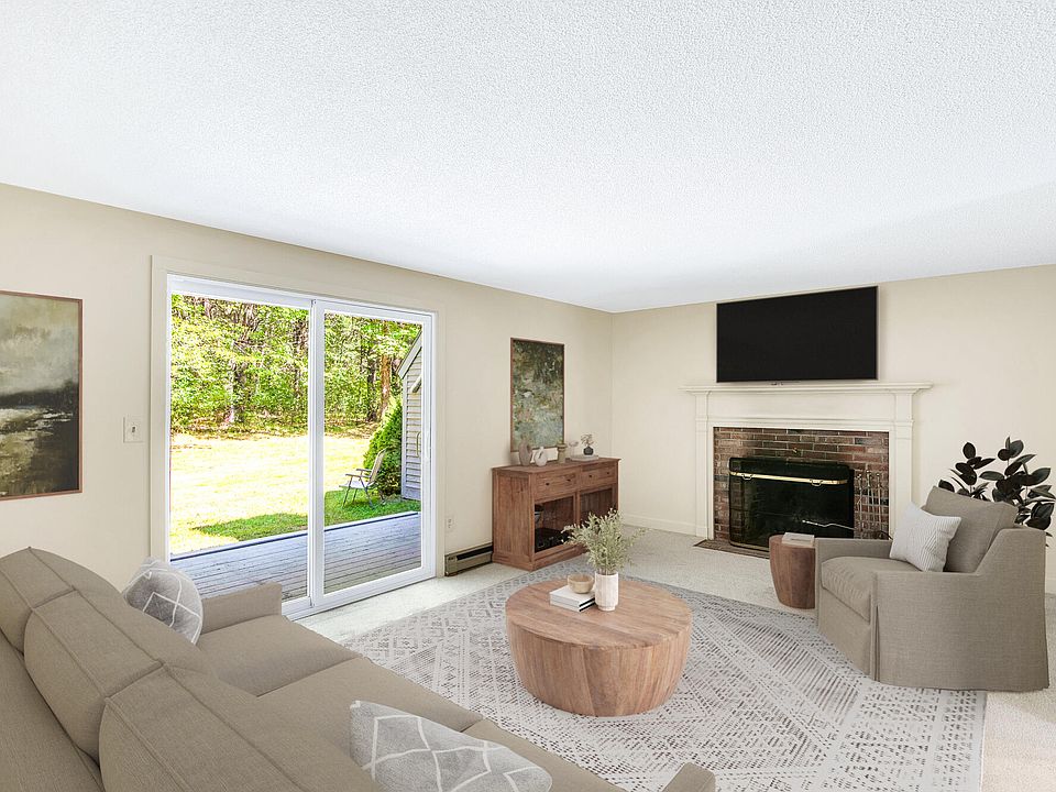 Significant price reduction for a fast sale. The kitchen and baths could use some cosmetic updates, but the home can be moved into as is. This end-unit condo offers so many positives, including a front patio, a private back deck, and a garage. Fresh paint throughout, brand new carpeting in the living areas and bedrooms, and a new slider leading to the back deck make this home feel welcoming and move-in ready. Set on a beautifully landscaped lot surrounded by mature trees, the bright layout provides an easy, low-maintenance lifestyle with plenty of natural light. The first floor features an open kitchen and dining area and a large living room with a wood-burning fireplace. Upstairs offers two good-sized bedrooms, and the third level includes an additional bonus room for extra space.
