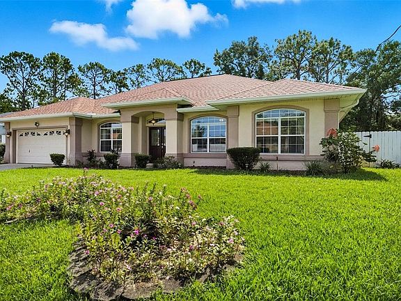 One or more photo(s) has been virtually staged. Welcome to your private pool retreat in sunny Palm Coast! This meticulously maintained 3-bedroom, 2-bath home also features a versatile flex room — perfect for a home office, playroom, or guest space. Step inside and enjoy high ceilings and a bright, open layout with tile flooring throughout the main areas for easy living. The kitchen offers a stylish tile backsplash, ample counter space, and a great view of the backyard oasis. Home also has a formal dining room and breakfast nook! All bedrooms are comfortably carpeted, offering cozy retreats at the end of the day. Outside, your fully fenced yard wraps around a sparkling pool — ready for year-round enjoyment. Plus, the irrigation system is on a well, helping you keep the lawn lush and green without the high water bill. Roof 2021. For extra peace of mind, home also comes with one year home warranty! Located in a quiet neighborhood on a cul-de-sac with easy access to beaches, shopping, and local dining — this is Florida living at its best!