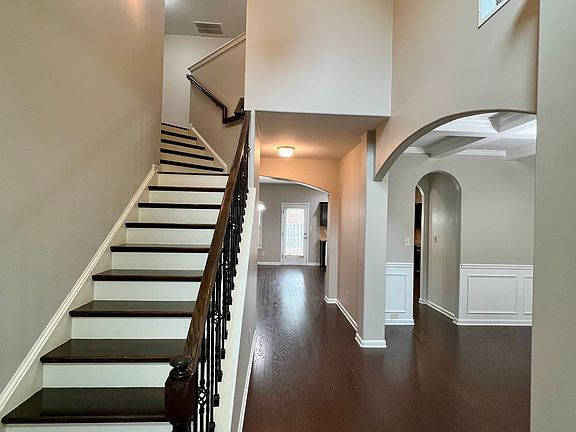 Kitchen has an island, granite countertops, stainless steel appliances, tile backsplash and a walk-in pantry. Open to breakfast area and family room with fireplace. Flex room with coffered ceiling on first floor could be a dining room, office, or playroom. Also on the first floor is a laundry room, half bath, and built-in drop zone coming in from the 2-car garage. Wood floors throughout main level. Patio out back leads to a fully fenced, low maintenance yard.