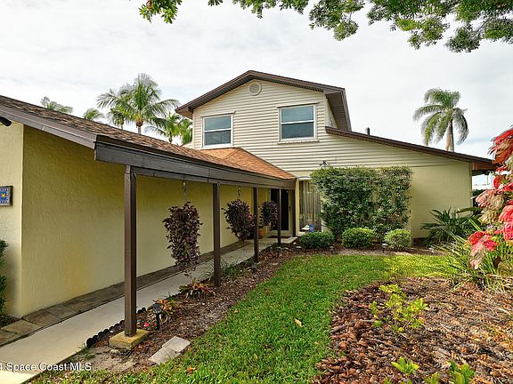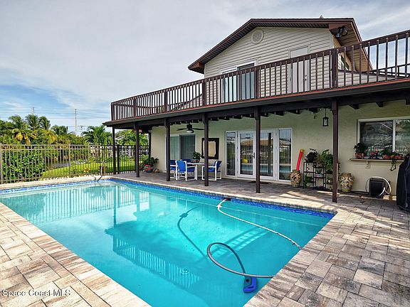 Upgraded 3-bedroom, 2.5-bath pool home in Indian Harbour Beach, near Eau Gallie Yacht Club. Situated on a large canal lot with 153 ft of frontage and a newer sea wall, this 2-story home was remodeled in 2019. The first-floor primary bedroom adds convenience. Updates include a new roof, resurfaced pool, fence, impact doors and windows, tile flooring, a modern kitchen, and renovated primary and half baths (2019). The A/C was replaced in 2022, making this home move-in ready. The open great room features wood beam ceilings and 24x24 tile flooring throughout the downstairs. The stylish kitchen boasts white cabinets, quartz countertops, a breakfast bar, and a built-in pantry. Enjoy stunning views of the pool and canal from most rooms. French doors lead to a brick-paved patio, pool, dock, expansive yard, and tranquil canal. Watch rocket launches from the upstairs balcony, which connects to the pool area via an exterior staircase. Call today for a private viewing; 24-hour notice required. pool area. Please call for a private viewing. 24 hour notice, please.