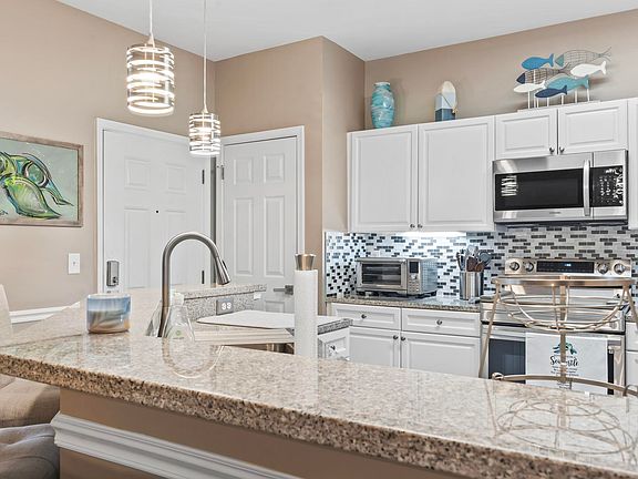 Discover the perfect opportunity to own a beautifully appointed ground-level unit with private garage in the desirable Addison community - just one mile and a short golf cart ride from the ocean! This 3-bedroom, 2-bathroom first-floor condo offers an open layout, featuring stylish vinyl plank flooring throughout. The kitchen is a culinary haven, complete with a custom-tiled backsplash, elegant countertops, a breakfast bar, ample cabinetry, and stainless steel appliances. The formal dining room, adorned with ornate picture moldings and flanked by classic columns, seamlessly flows into the spacious living area - ideal for entertaining guests. Large windows in the primary suite offer serene pond views, filling the room with natural light. The ensuite bathroom features a double-sink vanity and a stunning floor-to-ceiling tiled, step-in shower. Enjoy peaceful water views from the living room, primary bedroom, or your private newly screened-in porch. Two additional well-appointed guest bedrooms, with easy access to the hall bathroom, complete this thoughtful floor plan. Residents of this close-knit community can relax by the private pool, surrounded by a privacy fence, and enjoy the convenience of ample parking and the included private garage. With HOA fees covering water/sewer, cable/Wi-Fi, interior and exterior pest control, common electric, pool maintenance, and more, this property offers exceptional value. (Note: HOA fees listed include the garage.) Best of all, there are no stairs to climb - true single-level living at its finest! Don't miss this incredible opportunity. Schedule your private showing today and make this coastal retreat your new home! Measurements are not guaranteed. Buyer is responsible for verifying. Please ask your agent about lender closing costs incentives for this property.