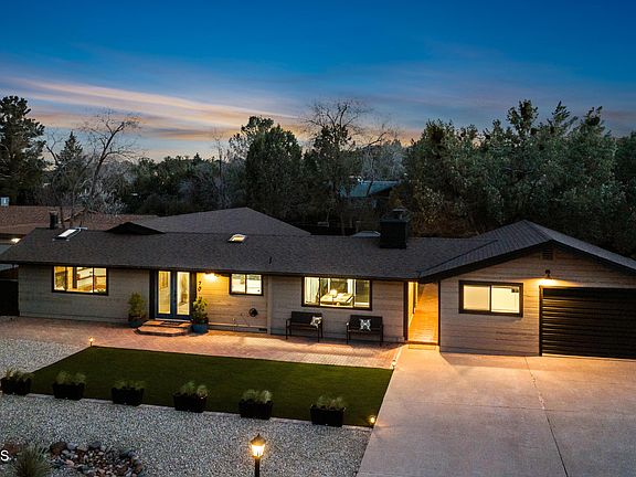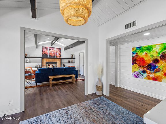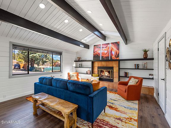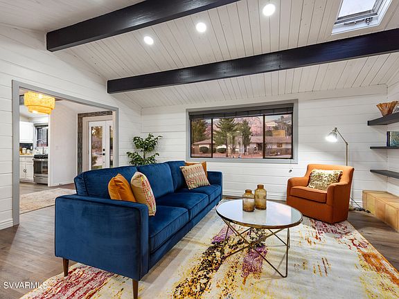 Artfully redesigned, refreshed and modernized with crisp, sharp details, this 3 bedroom 2 bath home in West Sedona offering a private backyard resort with no HOA is your perfect dream escape! Just pull in the driveway to see this reimagined gem. Interior upgrades and improvements include remodeled kitchen with rich glazed ceramic tropical bay blue tile, alligator floating wood shelving and crisp white quartz counters. Hickory Vinyl Plank Flooring flows throughout this home and accents the painted white interior walls highlighting the dark wood beamed ceilings, 2 fireplaces, and matted black merwry LED lighted ceiling fans. Additional improvements included New Roof, new skylights, 40 gallon commercial grade hot water heater, recessed lighting, modern new light fixtures, custom wood blinds, a Google Nest System, and matted black hardware. Bathrooms have been retiled and refreshed which adds to the farmhouse fresh feel of this home. Double Sliding Doors from Dining Room and Primary Bedroom open out onto a completely fenced backyard with privacy screening to enjoy living large outside! This backyard has myriad possibilities! Huge Flagstone Patio is complimented with a 13 x 15 rectangular steel roofed gazebo, 500 square foot synthetic turf etched with concrete borders is perfect for a game of cornhole, and Tuff Spa hot tub is skillfully placed behind Trex screens which can be accessed easily from both the backyard and the primary bedroom! Myriad stepping stones, paved covered and uncovered patios, and a darling bridge dot the exterior landscape. Plenty of room for organic gardens or perhaps a pool! Front yard too boasts holland old town pavers and synthetic turf which adds color and zing! Exterior freshly painted and finished with carriage lighting. 484 square foot garage is accessed from the home by a covered breezeway! No need to worry about getting wet from the rain when hauling luggage or groceries! Plenty of room for an RV too! Red Rock Views are seen from the living, kitchen, and dining room. On city sewer, natural gas and AZ water and within walking distance to shops and eateries on Sedona's Famed Hwy 89A, yet far enough to relax and unwind at the end of the day. And with all furniture available under a separate bill of sale - this is turnkey ready! So go on! Reimagine yourself here!