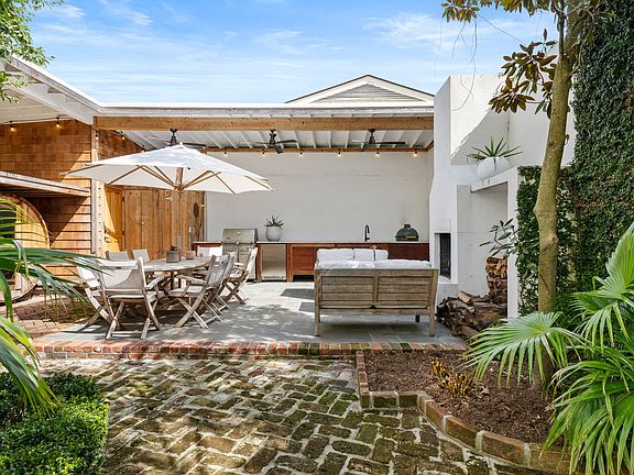 The private patio offers a seamless blend of luxury and comfort with a sauna, an outdoor shower, and a fully equipped outdoor kitchen featuring a grill, Green Egg, and a large dining table for al fresco meals. Unwind in the cozy lounge area by the outdoor fireplace, or simply enjoy the Charleston breeze in this thoughtfully designed backyard retreat.