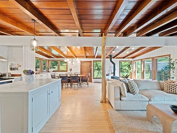 Located on a stunning 2.6-acre lot overlooking a private pond, the 2,200-sq ft. house provides plenty of space to unwind, including a pond-view balcony and an expansive patio. The open-floor-plan living room, dining room, and kitchen includes brand new appliances, a wood stove, wood floors, and lots of windows. The house also comes with a sunroom that's a prime spot for enjoying life on the pond, two fully equipped offices, a massive main bedroom (king), and a beautiful guest bedroom (queen).The home is set back from the road, on a beautiful tree lined driveway. You get the benefits of living a short 7-minute drive from downtown Cold Spring and the train station, while also feeling like you are in a wooded oasis.