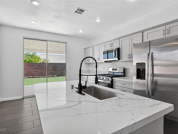 Immaculate 6 bedroom home in guard-gated community in Henderson. This property features one bedroom and full bathroom downstairs. Three full bathrooms and a two car garage with auto door opener. The property has been updated with brand new kitchen cabinets and new calacatta quartz countertops, new bathroom vanities, new LVT flooring, new berber carpet, new interior paint, etc. Large backyard with a patio cover and synthetic turf. Move in ready!