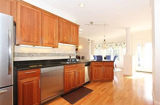 Beautiful large, sun filled, end unit. Unique design customized with many amenities that make you feel you are in a single family home. Foyer with columns, upgrades in kitchen, large 1st floor master, full dining room with working fireplace, heated sun room and composite deck. Walk out lower level with extra high ceilings, office, and guest suite with bathroom. Lots of storage incl custom cabinets, cedar closet and walk-in attic. All window treatments incl. Meticulously maintained. Gorgeous!