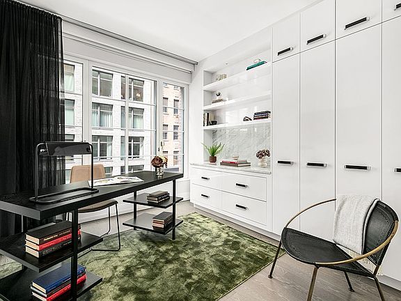 The property greets you with a chic entry gallery with chrome shelving, black lacquered walls, and a double sized coat closet with solid core wooden doors. A brushed aluminum sliding panel, custom made for the apartment, separates the gallery from the kitchen, leading you into the open kitchen and 24-foot wide living space. The kitchen is open, with overhanging peninsula Caesarstone and room for dining stools. There is rift-cut black cerused oak cabinetry with steel cabinet pulls and a glass backsplash. The appliances are a full Miele suite, including a vented gas range, an ice maker, and multiple ovens. There is a pantry for storage, and a large space for a dining table. The living room is huge, and allows for multiple seating spaces, a rarity in an amenitized new development.