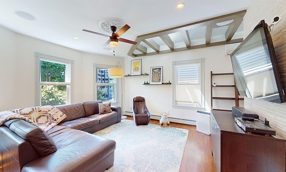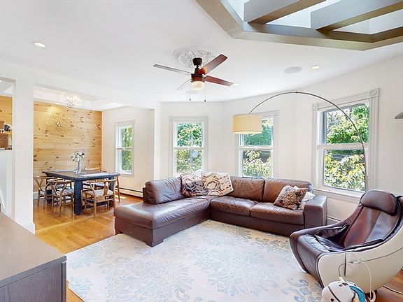 This elegantly designed top-floor condo features 2 levels of living space. Natural light floods through the numerous windows and skylights on both levels of this duplex. The main level boasts an open floor plan ideal for entertaining and has great separation from the bedrooms and private deck. The chef's kitchen features marble-styled quartz countertops, stainless appliances w/ gas stove and vented range hood, island, and farmhouse sink. Preparations to be served in a splendid dining area featuring a cathedral tray ceiling and a natural wood-finished accent wall. The primary bedroom/suite is on the upper level featuring vaulted ceilings and office space. The inviting neighborhood hosts a local grocery, cafes, shops, parks, recreational areas and everything Brookline Village has to offer. Brookline High School and Green Line are moments away, within walking distance to the Lincoln School and local private schools. Easy access to Longwood Medical Center, Downtown Boston, and Rt. 9.