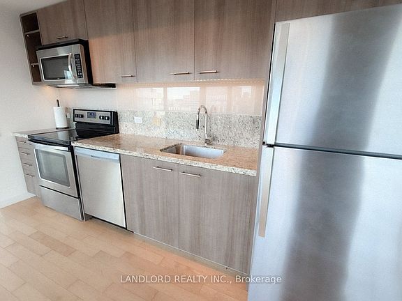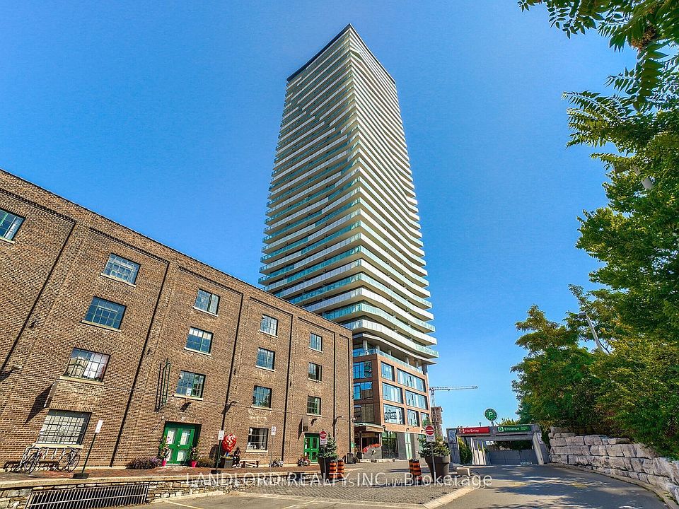 Vacant, move in ready, professionally-managed unfurnished east-facing corner suite set within Toronto's Distillery District! Parking and locker included. Space-efficient two bedroom two bathroom layout blessed in all rooms with wall to wall floor to ceiling windows looking east and north over the suite's own wrap around balcony. Both bedrooms generously sized, each with direct bathroom access. Primary bedroom in particular enjoys room-wide sliding glass door access to both its ensuite and walk in closet. Features and finishes include: hardwood flooring, stone kitchen countertop and backsplash with under cabinet lighting, stainless steel appliances, roller shades on all windows, all existing light fixtures, large foyer/entrance closet, entrance set back from main living area for more privacy. Refer to listing images for all building amenities. Tenant pays electricity on own meter.