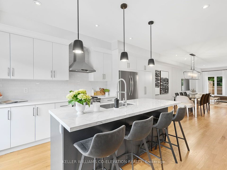 Nestled in one of Etobicoke's wonderful family friendly communities, this beautifully updated 3+1 bedroom, 3 bathroom freehold townhome offers modern comfort and stylish living across three well designed levels. The main floor features a bright, open concept layout that flows effortlessly from kitchen to dining to living, perfect for both entertaining and everyday life. The modern kitchen blends form and function, with extra storage and a dedicated coffee and bar area, while a discreet powder room adds everyday convenience. Upstairs, the spacious primary suite includes a walk-in closet and 4 piece ensuite, complemented by two additional bedrooms, a 4 piece family bathroom and the practicality of upper level laundry. The ground level lower floor is filled with natural light and offers a flexible space ideal for a 4th bedroom, rec room, home office, or gym. This level also provides direct garage access with space for coats and shoes, plus a roughed-in fourth bathroom for future possibilities. Step outside to a private backyard retreat featuring an outdoor bar, BBQ zone, dining space, and lounge area, perfect for summer gatherings or quiet evenings. Combining style, comfort, and location, this home is just minutes from shops, cafés, schools, and parks in a connected and wonderful community.