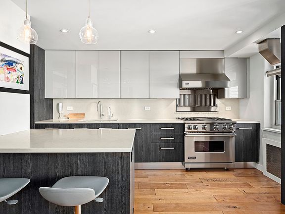 Masterfully renovated throughout, this exquisite 1,500-square-foot home welcomes you with rich wide-plank hardwood floors and tall ceilings finished with designer fixtures and recessed lighting. Throughout the residence, wide windows frame breathtaking northern views over the landmarked Grace Church, creating a dazzling backdrop. The desirable open layout is perfect for relaxing and entertaining with large living and dining areas surrounding a work-of-art open kitchen. Chefs will love the long island/breakfast bar, sleek cabinetry and upscale stainless steel Viking appliances, including a vented range, refrigerator-freezer, dishwasher and wine refrigerator.