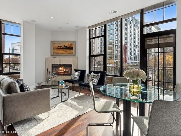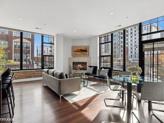 Sprawling three bedroom corner unit condo in boutique elevator building with prime South Loop location. Welcoming foyer entry leads to the spacious open concept living area with 10-ft ceilings flooded with natural light from the large windows with custom window coverings and south and east exposure. The living and dining area flow seamlessly making it an entertainers' dream with an inviting gas fireplace, unique exposed brick, integrated speaker system, hardwood floors throughout and private balcony. Chef's kitchen boasts high-end stainless-steel appliances including Subzero refrigerator, Wolf range, and wine cooler, a huge eat-in island with granite countertops and backsplash, and custom cabinetry with plenty of storage space. The primary suite features large windows with motorized Omnia blackout shades with remote and timer, large walk-in-closet, custom wardrobe cabinet, and an ensuite primary bathroom with dual sink vanity, glass enclosed shower, and separate soaking tub. Large second bedroom has hardwood floors, custom window coverings, ample closet space with Elfa shelving, and beautiful French doors making this a versatile space that could also be used as additional living area. Third bedroom also features hardwood floors and a BredaBeds Murphy bed and storage. Contemporary guest bathroom with large tub shower combo and laundry closet with stacking front load washer and dryer. Attached heated garage parking space included in list price. Extra low assessment includes high speed internet. Meticulously maintained throughout including a Daikin high efficiency 2 stage furnace new in 2021 with whole home humidifier, DustFree air purifier and 3-ton AC condensing unit, Ecobee smart thermostat, updated under cabinet lighting in 2020, new ceiling fan in 2019, updated faucets, all LED bulbs, replaced light switches and receptacles, and replaced the 50gal water heater (including a thermostatic mixing valve) in 2016. Excellent South Loop location with access to the lakefront trail, Museum Campus, Chicago Women's Park and Gardens, Prairie District dog park, and many wonderful shops and restaurants, with convenient access to the Loop, public transit and expressways.