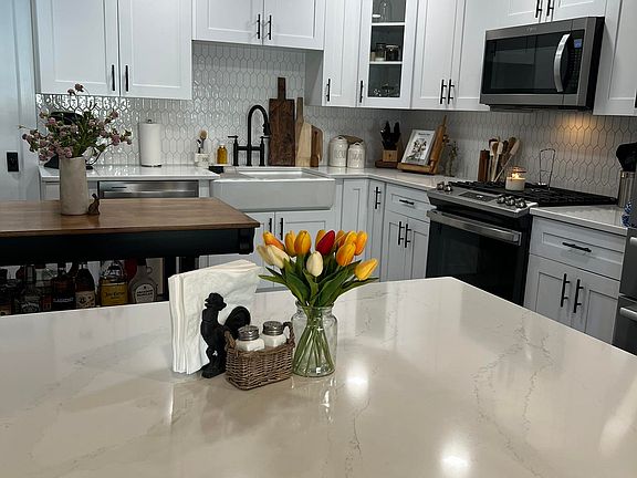 -Open concept living/kitchen space with gas range, stainless steel appliances, quartz countertops, and bar seating with a large pantry.