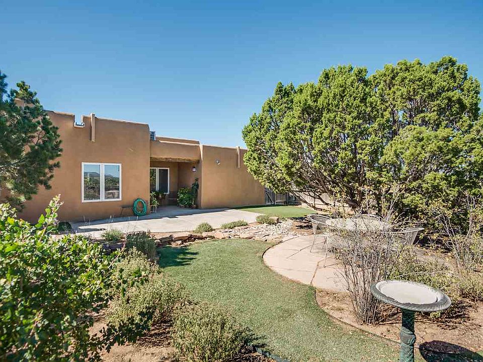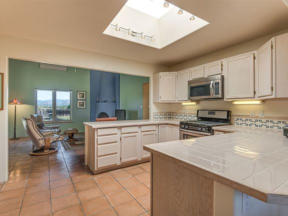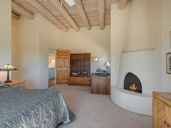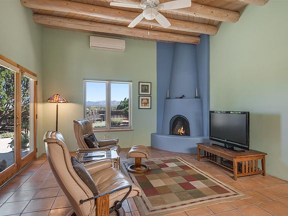 There are so many wonderful surprises in this custom home. Set on a 1.41 acre lot on a newly paved road with views in all directions. This home shows pride of ownership throughout...3 bed 2 bath 1890 sq ft,is thoughtfully designed...it is delightful. There are Vigas in the living area, the master bedroom and master bath. The separation of bedrooms is wonderful for owners and guests alike. There is a large foyer as you enter, leading to a formal living room and also a casual living room with a Kiva fireplace. The large master suite has a Kiva fireplace, Vigas, spacious walk-in closet and gracious master bath. The kitchen is well presented with tile counters, new stainless appliances, and the adjacent dining room make entertaining a joy. The garage can also accommodated an artist and has numerous skylights, a sink, expansive storage cabinets under the sink and gas panel heat. Three Fujitsu mini-split Air Conditioners and Heat Units were installed in 2014 as this newer technology solution supersedes as an alternative heating system to the Entran system.