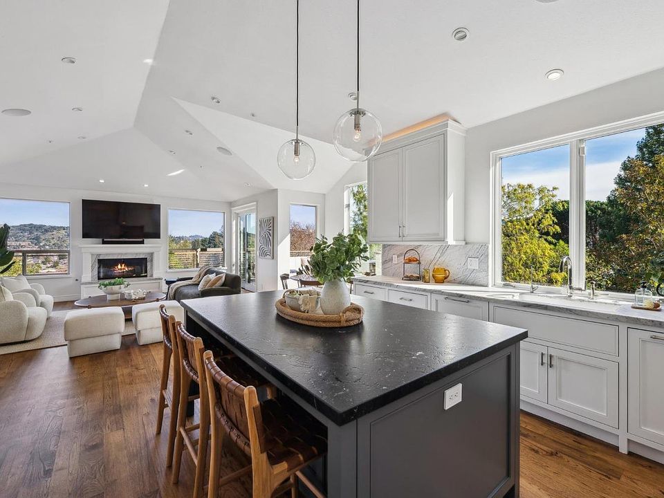 Situated on just under 2 acres of land, this exquisite 4400+ sq ft home offers the perfect blend of luxury & a strong connection to nature. With soaring ceilings & views from nearly every window, this spacious, updated 5 bedroom + office abode provides ample room for both relaxation & productivity. The great room is the heart of the home & includes a sunny family room, gourmet kitchen & dining area, perfect for everyday family living. The adjoining formal living & dining rooms provide the ideal space for entertaining & celebrating. The huge primary suite is a true sanctuary, complete with a cozy fireplace, luxurious bath with two-person shower & freestanding tub, & a private outdoor lounge area. 3 guest bedrooms (1 ensuite) share an additional family room & all have direct access to the exterior. The large, level lawn creates plenty of space for outdoor activities & the wrap-around deck is perfect for gathering with family & friends or simply enjoying the serene surroundings. The generous laundry room, 3-car garage with 2 storage/work areas make this home perfect for meeting the needs of an active family. With hiking, Hwy 101 & all Mill Valley has to offer at your fingertips, this estate checks all of the boxes!