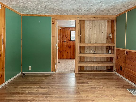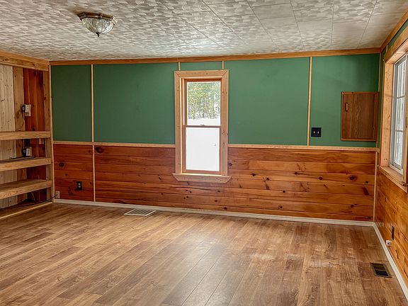 Modified Saltbox with two bedrooms and one bathroom on 5.46+- acres. The main floor has a kitchen, living room, dining room, bathroom, small office space, and a bedroom. The second floor has a bedroom and a finished storage room. The home has pine wood working and nice flooring. Located on a dead end dirt road and a nice private lot. The basement has a one bay garage for additional storage.