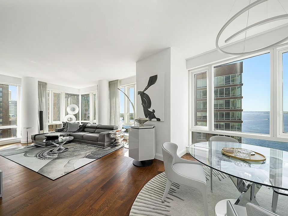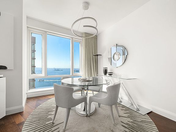 A rarely available three-bedroom two and half bath home at the Pelli-designed Visionaire is offered in mint move-in condition. Upon entering, the full-length panoramic glass curtain wall immediately draws focus to the spectacular views of the Hudson River, Statue of Liberty, and the grandeur of the downtown Manhattan skyline — all of which can be taken in from the comfort of the spacious living area. The separate dining area offers equally stunning views while dining and entertaining guests.