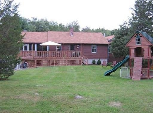 Nestled on a 3 acre lot--Large ranch, open floor plan with potential in-law suite. 4 bedroom, 3 full baths, 3 bay heated garage. Energy efficient updates include two hot air solar heating panels, high-efficiency boiler installed in 2007, and a whole house fan. Spacious eat-in kitchen with new Corian counters. Large addition in 2001 makes this home unique like no other. If you like privacy, ample storage, and an in-law style living-this house is for you!