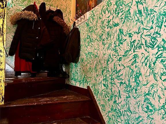 Cozy backyard patioArtistic charmWhimsical staircaseWood floorsColorful wallsVibrant living spaceFenced yard