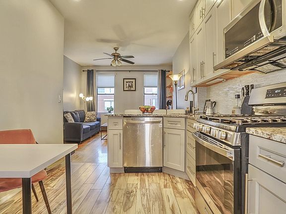 Renovated 2 bed, 1 bath condo with open living and kitchen layout, stainless steel appliances, granite countertops, and large breakfast bar. Features hardwood floors, high ceilings, in-unit W/D, ceiling fans, custom soft-close cabinets, and USB outlets. West-facing windows offer beautiful sunsets. Building recently completed a new roof and basement storage renovations. Shared backyard included. Just a few short blocks to PATH and Hoboken Bus Terminal; with restaurants, parks, and public parking nearby. Modern comfort meets unbeatable convenience.