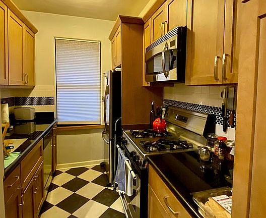 Spacious renovated one bedroom with beautiful open kitchen with wood cabinets, stainless steel appliances, granite counters with tile and granite backsplash and pantry closet. The kitchen window overlooks the gardens as well making this a very pleasant roomin which to work.