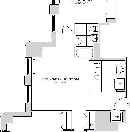 This two bed two bath apartment features spacious primary bedroom with a dedicated dressing area with an en-suite primary bath, spacious living/ dining area, second bedroom with double exposure windows, gourmet kitchen with stainless steel appliances, stone countertops and an eating bar, high ceilings, wood floors throughout, and in-unit washer/dryer.