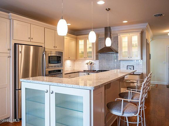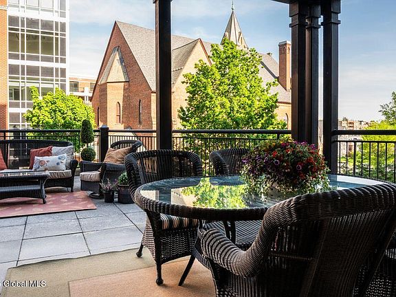 Downtown Saratoga living at its best! This 2nd-floor 2 bed, 2 full 1 half bath corner condo at 70 Railroad Place features a spacious patio overlooking the Universal Preservation Hall—perfect for al fresco dining and enjoying skyline views. Inside, a gourmet kitchen with creamy cabinets, glass doors, and a center island opens to a bright living space with tall windows. Steps to dining, shopping, nightlife, and year-round events like horse racing and SPAC performances. Two garage parking spaces included. Live the vibrant, four-season Saratoga lifestyle!