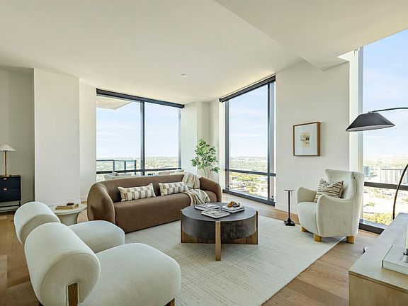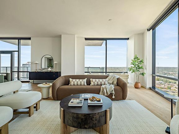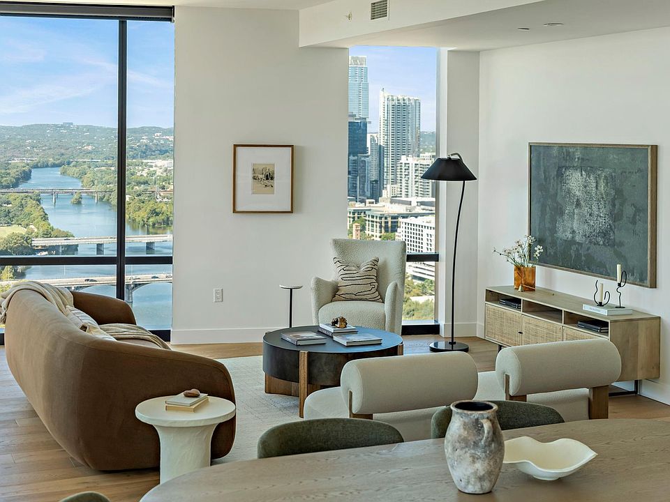Where understated elegance meets modern luxury, this exceptional residence offers breathtaking panoramic views of Lady Bird Lake and the downtown Austin skyline. Located just steps from the Butler Hike and Bike Trail, this three-bedroom home with a bonus den/office wraps the entire southern end of the building, featuring floor-to-ceiling windows that capture the beauty of sunrise to sunset. The open-concept layout seamlessly connects the living, dining, and kitchen areas, extending to a spacious patio ideal for outdoor entertaining. The east-facing primary suite includes a cozy seating area and a spa-like bathroom with dual vanities, a soaking tub, a glass-enclosed shower, and a custom walk-in closet. Smart home automation features include built-in speakers and motorized shades throughout. This residence includes three reserved parking spaces conveniently located on the first level of residential parking. Residents of 70 Rainey enjoy over 31,000 square feet of private indoor and outdoor amenities, including an infinity-edge pool with sundeck, hot tub, cold plunge, outdoor dining areas with TVs and grills, lush landscaping, and a dog park. Indoor spaces offer multiple lounges, private dining areas, a theater room, a state-of-the-art fitness center, and 24/7 concierge service.