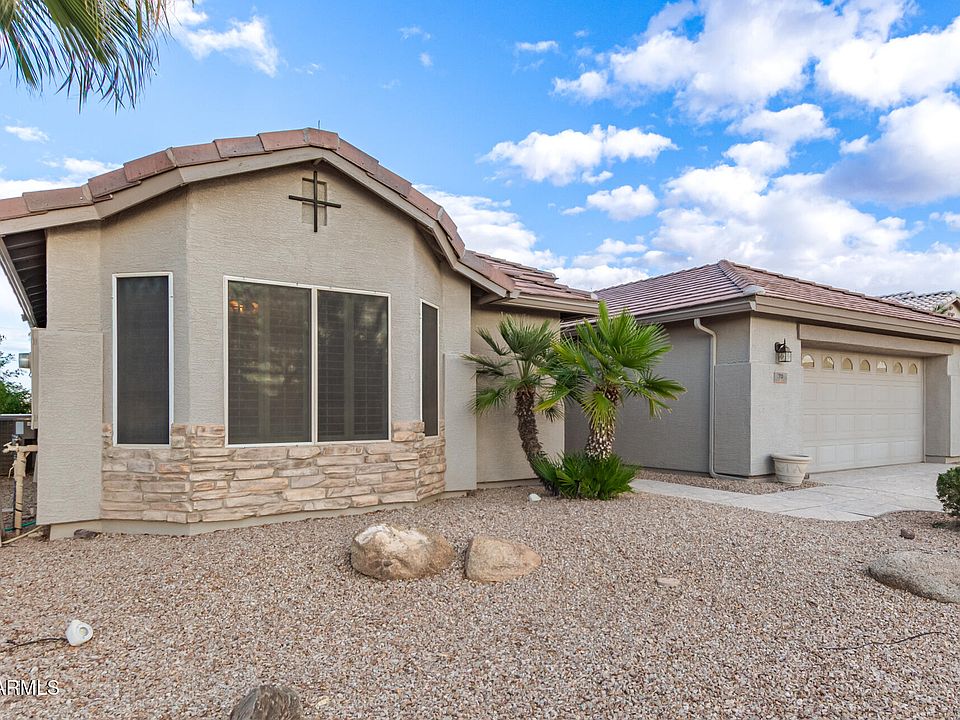 Charming 2-bedroom home located in the active adult community of Mission Royale w/ stunning golf course views and overlooking the 11th hole. Displaying 2-car garage & low-maintenance landscape. Inside, you'll discover an inviting great room offering abundant natural light, neutral palettes, vaulted ceilings, & tile flooring in high-traffic areas. The kitchen showcases wood cabinetry, a walk-in pantry, SS appliances, granite counters, tile backsplash & a breakfast bar. The den is ideal for an office or media room. The main bedroom hosts a private bathroom w/ dual sinks & a walk-in closet. Make unforgettable memories in the backyard, complete w/ a