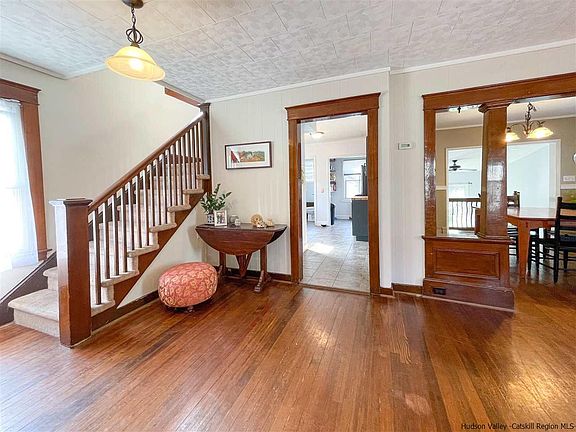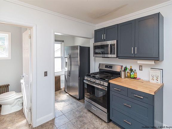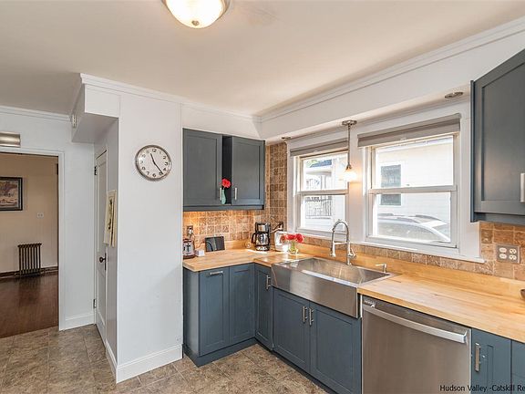 MUST SEE home in red-hot Kingston features a brand-new kitchen and deep landscaped yard! Just minutes to both Uptown, the Rondout Waterfront, this quiet midtown street is a five-minute walk to culinary favorites, The Beverley Lounge & Lis Bar, and 15 minute walk to performances at UPAC and all the exciting restaurants on Broadway. Enter the home through a wide 3 season porch, great for stowing gear or relaxing with your morning coffee. Inside, the original Arts and Crafts open floor plan features a colonnade pedestal wall dividing the long living room from the formal dining room. Cook in the freshly renovated kitchen, with butcher block countertops, extra large stainless sink, and all new 2021 appliances. The light filled kitchen has ample storage space, and access to the first floor half bath. Off the dining room, step down to the sun drenched family room, which would also make a great exercise room or home office. Large sliding doors lead to the private backyard - a gardeners paradise full of native perennial plants, a cut flower garden, and fruit & vegetable plots. Use the detached one car garage (new roof in 2018) as a workshop, art studio, or finish for added living space. Do you want even more room for creativity and storage? There's a large partially finished basement (currently used as a music studio) and an unfinished walk-up attic for your needs! Upstairs, two well-sized bedrooms with deep closets, a smaller third bedroom for nursery, office or guests, the full bath with lots of storage, and a hallway linen closet. The owners have exposed hardwood flooring in the bedrooms and on a few stairs. This home is ready for the next owners to add their finishing touches!