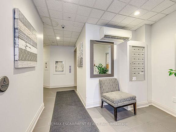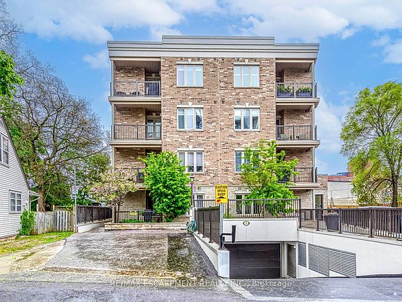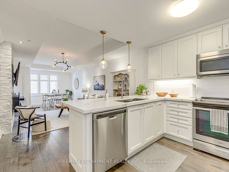 Stunning 2 bed, 2 bath suite in the heart of Kerr Village. With over 900 square feet of thoughtfully designed living space, this top-floor unit in an exclusive 4-storey low-rise building is a rare find. The open-concept living space features 9-foot ceilings, wide-plank hardwood floors, and crown molding throughout, creating a bright and sophisticated atmosphere. The gourmet kitchen boasts premium white cabinetry, quartz countertops with waterfall edges, hidden pantry a full suite of stainless steel appliances, and elegant pendant lighting over a spacious breakfast bar. The adjacent living and dining area is both stylish and functional, with large windows with California shutters that fill the space with natural light and provide a seamless flow out to the private balcony. Enjoy morning coffee or unwind in the evening surrounded by lush greenery and serene views.The primary bedroom offers a tranquil retreat with custom built-in wardrobes, ample closet space, and a calming neutral palette. A versatile second bedroom can serve as a guest room or home office, complete with mirrored storage and a built-in workspace. The bathrooms feature refined finishes including marble-look tile, modern vanities, gold hardware, and designer lighting.Additional highlights include in-suite laundry, upgraded lighting fixtures, and thoughtful storage solutions throughout. The furnace has been recently serviced and is in good working order, adding peace of mind. The suite includes in-unit laundry, a tandem two parking spot on P1 for two cars, and a private storage locker. Step outside and you're moments from multi-million dollar homes, the tranquil shores of Lake Ontario, vibrant Kerr Street, and downtown Oakville. Enjoy the serenity of nearby green spaces like Tannery Park and 16 Mile Creek, while staying connected with quick access to Oakville GO Station and major highways. You will love calling this home.
