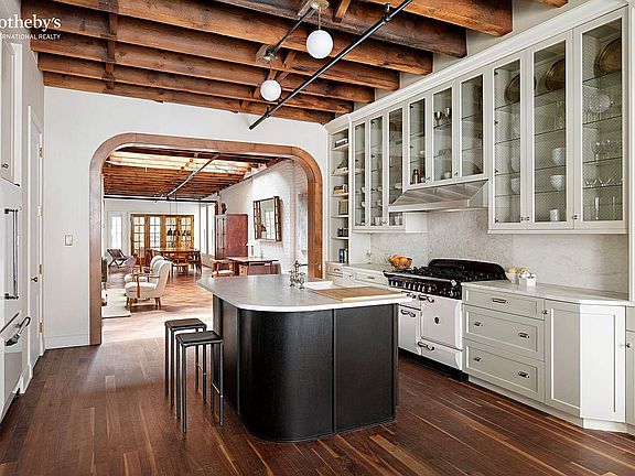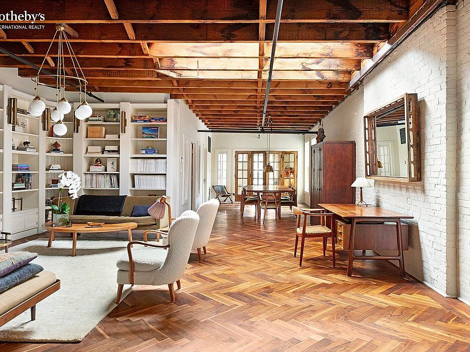 The sun-flooded, full floor loft is offered in superb condition with central air conditioning and beautiful walnut floors in a herringbone pattern. The enfilade of airy, open spaces features ceilings rising to almost 12 feet, a large skylight, the historic building’s signature wood ceiling joists, and original brick walls. The expansive Dining Room and a bookshelf-lined Living Room open onto a large open plan Chef’s Kitchen. The gourmet Kitchen is anchored by a massive center island flanked by abundant custom cabinetry and includes a classic 6-burner AGA range, a Marvel refrigerator and freezer, a Miele dishwasher, and a Uline wine storage unit and flows seamlessly into the adjacent Breakfast Room. A sliding steel door serves as a distinctive focal point, reinforcing the building’s industrial past, while leading to a Second Bedroom with a walk-in closet, which backs up to a Powder Room, which has the potential to be converted to a second full Bathroom.