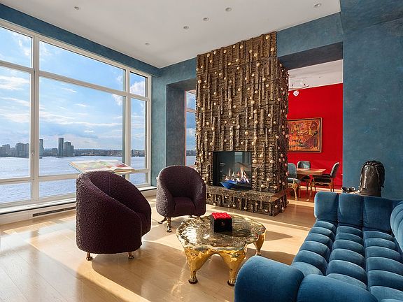 A private elevator delivers you into the foyer that overlooks the courtyard of this iconic building. Entering the home you are met by the expansive corner great room with unobstructed Hudson River views. The impressive chef’s kitchen boasts a suite of Miele appliances, floor-to-ceiling custom cabinetry, a marble breakfast bar and opens onto a terrace for al fresco dining. A study, an office and two powder rooms round out the public spaces on this level.