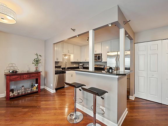 River North on the 19th floor with east city skyline views this 827SF 1 bed/1bath with floor to ceiling windows lets the sunshine in. Open for entertaining with full dining, granite counters, bar/island, SS appliances, hardwood floors throughout, fresh paint, smooth ceiling, repurposed custom shelving, ample custom built in closets by Closet Works guaranteed for life, remodeled bath, private balcony, and storage. Lower taxes and assessments also include internet and cable. The Hermitage on Huron offers 24 hour door staff, exercise room, hospitality room, sundeck, sauna, laundry room, on site engineer and management, receiving room, bicycle room and convenience store. Walk to Whole Foods, Trader Joes, Red Line, Brown Line, Magnificent Mile shopping and all the fabulous River North and Michigan Avenue restaurants, bars, and theaters.