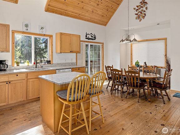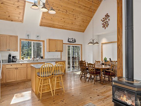 Nestled on a 1/2 acre lot, this beautifully crafted 3-bedroom, 2-bath home features an open-concept design and a wrap-around deck perfect for enjoying the serene surroundings. Great room boasts vaulted T&G ceilings, cozy free-standing propane stove, and knotty pine floors. Ideal for entertaining, open concept living offers a seamless flow from the kitchen into the great room. Primary suite on the main floor with attached 4 pc bath. Upstairs, 2 additional bedrooms, full bath, and versatile loft area provide plenty of room for guests. Detached 2 car garage with overhead storage provides room for all your toys. Low-maintenance landscaping and ample parking. Easy access to trails with four seasons of outdoor recreation just out your backdoor!