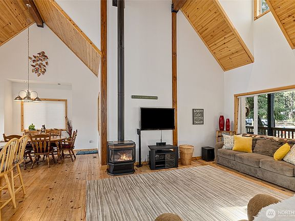 Overhead storageWrap-around deckLow-maintenance landscapingOpen-concept designCozy free-standing propane stoveKnotty pine floors