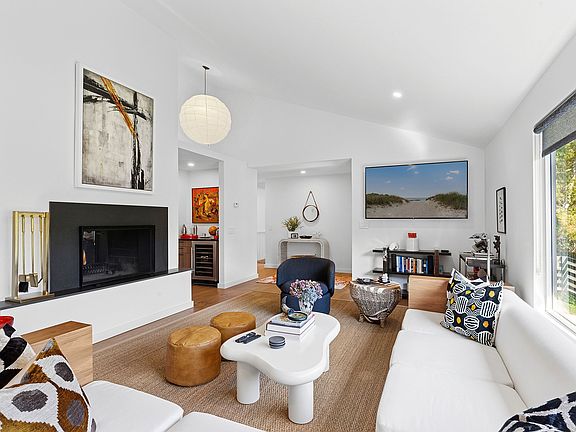 Introducing a meticulously renovated Mid-century modern home ideally located between East Hampton and Sag Harbor! Set on a picturesque .46-acre lot bordering a 21-acre nature preserve, this spectacular home offers everything you would expect in a move-in ready new-build, without the hefty price tag! Features in this 2025 renovation include a new roof, board and batten siding, hardwood floors, large energy efficient Pella windows, new HVAC, all new plumbing and electrical wiring, galvanized steel gutters, along with new landscaping materials, outdoor lighting, and an irrigation system. Upon entering this chic home, you'll immediately notice the light-filled living room accented by ceilings that soar to 14 feet at the apex. A major focal point is the majestic double-sided fireplace which serves both the living room and dining room and anchors the open-concept layout. New Havwoods wide-plank oak floors throughout the main level offer durable, yet tasteful luxury. The sleek chef's kitchen blends form and function and features Bosch appliances, Caesarstone countertops, ample workspace, storage, and a wine bar. Down a new set of stairs, the partially finished basement has high ceilings and includes a laundry area, 2-car garage and workshop, and can easily fit a home gym, media room, or wine cellar, if desired. This wonderful home is currently used as a 3 bedroom/3 bath residence with a home office that overlooks the pool area and beautifully landscaped backyard. The pool is easily accessed from multiple interior points, providing seamless indoor/outdoor living with serene, wooded views and privacy.If you are looking for a conveniently located, turn-key, Hamptons retreat, this is it. Come and see that you can have it all!