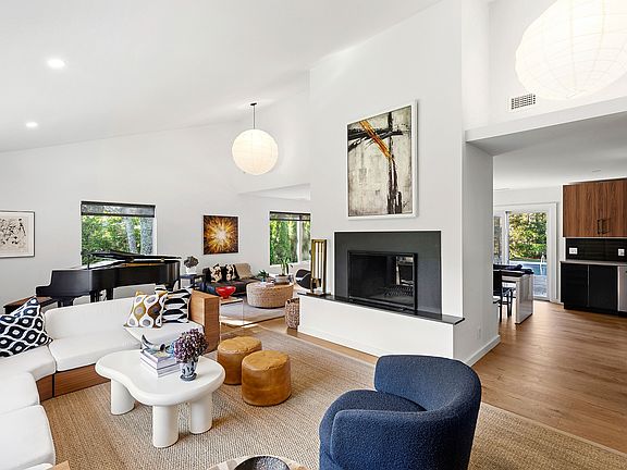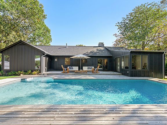 Introducing a meticulously renovated Mid-century modern home ideally located between East Hampton and Sag Harbor! Set on a picturesque .46-acre lot bordering a 21-acre nature preserve, this spectacular home offers everything you would expect in a move-in ready new-build, without the hefty price tag! Features in this 2025 renovation include a new roof, board and batten siding, hardwood floors, large energy efficient Pella windows, new HVAC, all new plumbing and electrical wiring, galvanized steel gutters, along with new landscaping materials, outdoor lighting, and an irrigation system. Upon entering this chic home, you’ll immediately notice the light-filled living room accented by ceilings that soar to 14 feet at the apex. A major focal point is the majestic double-sided fireplace which serves both the living room and dining room and anchors the open-concept layout. New Havwoods wide-plank oak floors throughout the main level offer durable, yet tasteful luxury. The sleek chef’s kitchen blends form and function and features Bosch appliances, Caesarstone countertops, ample workspace, storage, and a wine bar. Down a new set of stairs, the partially finished basement has high ceilings and includes a laundry area, 2-car garage and workshop, and can easily fit a home gym, media room, or wine cellar, if desired. This wonderful home is currently used as a 3 bedroom/3 bath residence with a home office (or 4th bedroom) that overlooks the pool area and beautifully landscaped backyard. The pool is easily accessed from multiple interior points, providing seamless indoor/outdoor living with serene, wooded views and privacy.If you are looking for a conveniently located, turn-key, Hamptons retreat, this is it. Come and see that you can have it all!