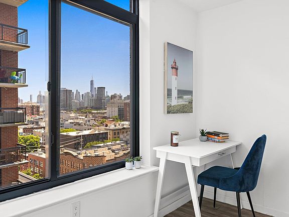 Welcome to this large, updated, one-bedroom & one-bathroom condominium, with a rentable parking space, in the much sought after Sky Club elevator building in the heart of Hoboken! This upper floor unit boasts 900 Sq. Ft. of open concept living space along with a beautiful balcony to enjoy the outdoors. No expense was spared updating this spacious unit. Kitchen features stainless steel appliances, granite countertops, a generous breakfast bar with stunning light fixtures. This unit is designed to maximize square footage, storage, and functionality! Recent upgrades include professionally finished bamboo flooring throughout. Step through the beautiful patio doors to enjoy a beautiful summer day or serene evening on your private balcony with stunning views of downtown Manhattan. The large bedroom is a delight and can double as a home office. This is a pet friendly, steel and concrete building with a chic modern lobby, 24/7 concierge service, a community room, a secure package room, a game room, onsite 25,000 sq. ft. fitness center with Olympic size swimming pool for additional monthly fees, colorful and immaculately landscaped grounds, and a free shuttle to/from the PATH. Located in the Southwest corner of town, where residents can enjoy quick access to vibrant boutiques, shops and nightlife. A short tour will lead you past a wine shop, a homemade ice cream café, dry cleaners, myriad daycares, a dog park, a small water park, al fresco dining, and so much more! The NYC commute is quick and convenient whether you take the bus, the Light Rail, or a Shuttle to the PATH. This is a wonderful opportunity to enjoy “uptown” luxury living in downtown Hoboken. Garage Parking available to rent in the building at additional cost.