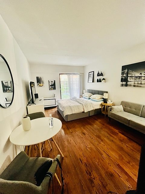 Studio apartment on the 2nd floor of Walk up building. Entrance foyer has a closet and full bathroom plus hardwood floors throughout the apartment. Spacious living area fits a Queen size bed room for couch, table& dressers. Separate chefs kitchen has stainless steel appliances. Juliette balcony. NO BROKER FEE. $20 Application