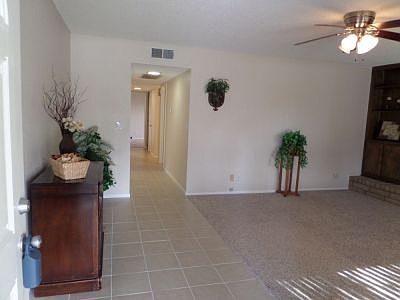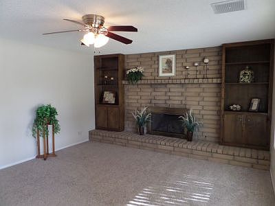 Lovely shaded front yard shelters remodeled home. Inside all is new! Fresh paint everywhere. Tiled floors from front door, down the hall, both bathrooms, & large eat in kitchen. New carpet in living rm and bedrooms. Living rm has slumpstone fireplace/ gas log w/hearth; flanked by built in cabinets; ceiling fan. Kitchen has tiled counters' pantry w/pull outs. Slider gives view of covered patio. Two nice sized guest bedrms w/fans. Guest bath has tiled counter and tub walls.Master has walk in closet w/ remodeled 3/4 bath. Two linen cabinets in hallwall. Garage has sink, newer water heater, garage door opener. Out back are two sheds and double RV gate.Lots of pine trees and oleanders. Carrier dualpac installed 2002. Ground mounted Trophy evap. Home sweet home! Dicomp roof.
