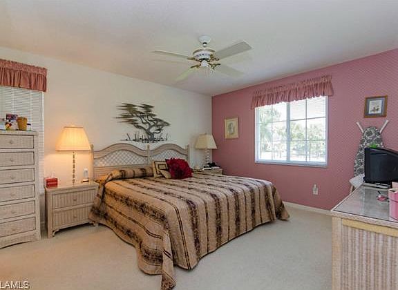 Beautiful light filled end unit boasts a view of lush green lawns & a sparkling lake from spacious screened tiled lanai. Large living & dining area features vaulted ceilings, wood look laminate flooring & updated paint colors. Gorgeous all white kitchen has tile backsplash, updated cabinets, plank tile flooring & a breakfast nook. Owner's suite enjoys a nice view of lawns & lake, huge walk-in closet with built ins, plus a newly tiled shower with glass doors & updated vanity. 2 guest bedrooms feature extra windows with lots of light & an adjacent updated bath for when friends & family visit. Utility room is bigger than most in a condo and has a built-in work/desk area & nice cabinet storage space. AC & water heater were replaced in 2017! Close to the community pool & tennis courts plus unit comes with a covered carport. St Regis is very convenient to I-75 and downtown Naples pristine beaches & wonderful dining & shopping.