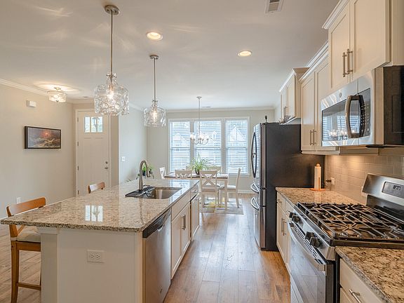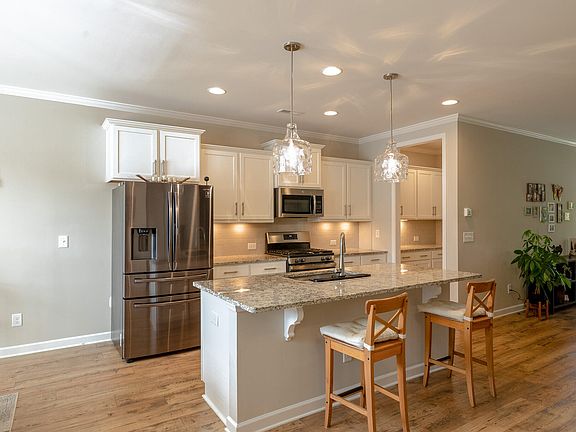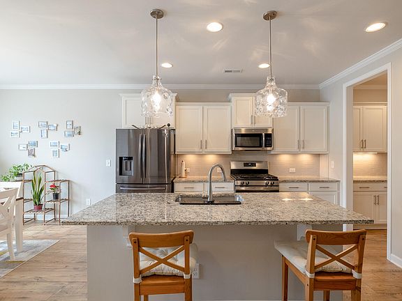 Beautiful 3 Bedroom Townhome Backing to a Wooded Buffer with Designer Upgrades Throughout! This stunning home offers a perfect blend of style, comfort, and functionality — featuring a 2-car garage with unfinished basement and a peaceful wooded buffer for added privacy. Step inside to discover 7.5'' wood-style flooring and crown molding flowing throughout the main living areas, creating a warm and elegant atmosphere. The gourmet kitchen is a showstopper, showcasing custom painted cabinetry, ''Moonlight'' granite countertops, undercabinet lighting, and a double trash can cabinet for convenience. Enjoy a center island with a breakfast bar, designer pendant lights, and recessed lighting. Stainless steel appliances, including a gas range, make this kitchen ideal for both everyday living and entertaining. A spacious walk-in pantry and butler's pantry—each with granite countertops and tile backsplash—add extra storage and style. Relax in the inviting family room, featuring a custom shiplap accent wall and ceiling fan for a cozy touch. The primary suite is a true retreat, boasting a tray ceiling with crown molding, ceiling fan with light, and a walk-in closet with custom shelving. The primary bath includes a tile-surround shower with bench and niche, plus a linen closet for added convenience. Step outside to your covered back porch, the perfect spot to unwind while enjoying peaceful views of the wooded buffer — ideal for morning coffee, evening relaxation, or entertaining friends. This home truly has it all — modern finishes, thoughtful details, and a tranquil setting that feels like home. Tons of storage space!!!!!!