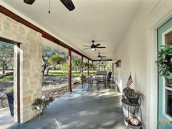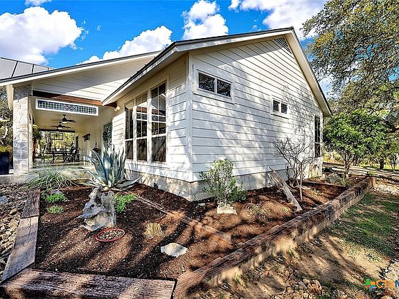 Tucked away on five acres of mature oaks, wildflowers, and native Texas plants, this inviting Hill Country home offers a peaceful retreat surrounded by nature. The expansive front porch is perfect for entertaining or unwinding under the cooling fans, while the covered breezeway to the garage provides a decked sitting area ideal for enjoying breathtaking Hill Country sunsets. Spend evenings by the fire pit under the stars or explore the winding paths while spotting deer, foxes, turkeys, hummingbirds, and butterflies. Step through the French doors into a open living space filled with natural light, trey ceiling, and tastefully updated finishes. A mock fireplace adds charm and warmth, while the spacious primary suite offers ample space for a sitting area, office, or reading nook. The remodeled kitchen boasts quartzite countertops, a Kohler farm sink, and a tile backsplash, while the laundry room provides generous storage and a walkthrough closet to the primary bedroom. The oversized garage includes a utility sink, toilet, and outdoor shower, along with workshop countertops and additional attic and loft storage. A solar-powered custom entry gate welcomes you home, complementing recent upgrades such as a new HVAC system, water softener, well motor, seamless metal roof, and asphalt driveway. Inside, fresh paint, new trim, fans, lights, doors, hardware, and flooring throughout give the home a polished, modern feel. High-speed Spectrum internet ensures seamless connectivity for remote work. Located 10 minutes from Wimberley, with its charming downtown and famous Blue Hole swimming area, and 20 minutes from Gruene, home to the legendary Gruene Hall and riverside dining, this home is perfectly positioned to enjoy the best of the Hill Country. San Marcos, with its university atmosphere and crystal-clear river, is just a short drive away, while Austin and San Antonio offer world-class dining, music, and culture within easy reach. Come experience the tranquility for yourself!