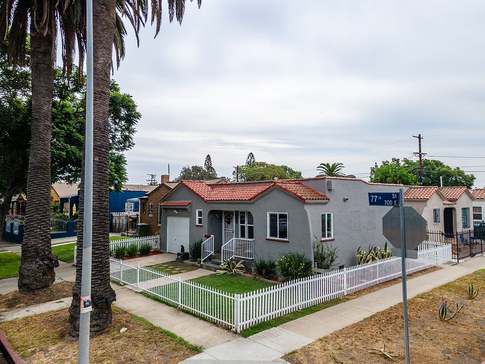 Charming 1930s California Spanish Bungalow with a great curb appeal set behind two massive desert palm trees in Los Angeles. The home is 792 SqFt with 2-bedrooms, 1-bathroom, and attached 1-car garage. Enter into an open floorplan with beautiful wood-like laminate floors, recessed lighting, and nice windows bringing in an abundance of natural light. The living area offers space for lounging and flows smoothly into the dining area and bar seating in the kitchen. The kitchen has gorgeous countertops, dark cabinets, a large sink, appliances, and is adjacent to a separate laundry hallway with outdoor access. The bedrooms are good sizes with light/fan fixtures, two windows each, and lovely flooring. The bathroom has all the necessities like a glass-doored bath/shower, a vanity, and window for air circulation. A paved backyard offers a fine space to BBQ, relax, or entertain. In a quiet neighborhood, but not too far from restaurants, shopping, and markets. Easy access to the 110-freeway, and less than 7 miles from Downtown Los Angeles.