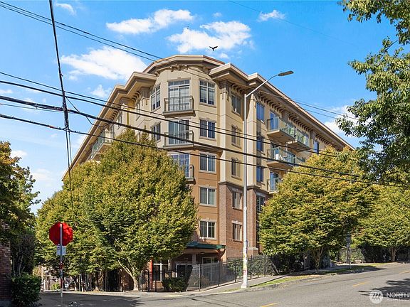 A rare 3 bedroom Penthouse unit on top floor comes w/3balconies +4 parking spaces!, & high ceilings! Sweeping West facing, 180 degree views of mountains, sound, bay, ship canal, city, & Space Needle! This light filled, modern, 1-level unit has all the amenities, space to spread out +w/dryer in unit. The HOA board approved adding hardwoods, A/C mini-splits & is figuring how to add EV chargers. One of the most walkable locations! Light rail station is a five minute walk! Secure garage & lobby entrance. No rent cap & pet friendly. Seller pre-inspected...ask me for it. Can do your own if you want. Secure bike storage. Rent for parking spaces get $180-$250/month; must be people living in building. Extra $$$ if you do not need all 4 spaces.
