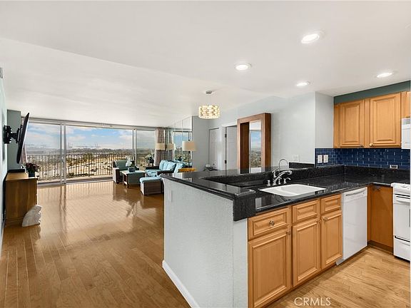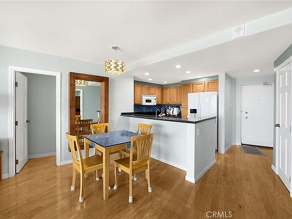 The open-concept floor plan flows seamlessly from a modern kitchen adorned with black granite countertops into a spacious living and dining area, featuring warm, natural hardwood floors. Wake up every morning to ocean views and the Queen Mary.