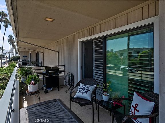 This coastal haven can be yours. Access to the beach is literally across the street from this spacious one-level unit. It offers two bedrooms and two baths, with plenty of storage. Its living room is large enough to entertain family and friends, all at the same time. Enjoy sun up every morning on its extra long balcony that faces Catalina. You will fall in love with the appliances in the kitchen. The handles and solid-wood panel traditional cabinets were meticulously chosen for a classic, timeless look. You will enjoy extra plushy carpeting in the bedrooms, tile floors in the bathrooms, and the perfect bamboo floors throughout the home, which is the best choice of wood flooring for all furry friends. This open-floor concept unit has also been freshly painted for a true beach retreat feel at home. In addition, the balcony is slightly longer. You won't share the south wall with anyone. There are small storage units on that side versus a next-door neighbor. The home has two car spaces side-by-side, a separate storage room next to the elevator, a meeting/club room, a fitness room, and security cameras throughout the building. This secured building's HOA dues include gas, water, trash, and outside maintenance. Hop to the pier, skip to the Riviera Village, and jump into the water! Don't let your staycation escape you.