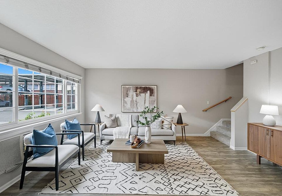 Designer paint palette and gorgeous carpets! Newer window coverings and almost new full sized stackable washer and dryer. Two large bedrooms. One full bathroom upstairs, half-bath/powder room on main level. Beautiful kitchen is well appointed with solid surface Granite countertops, full sized AEK stove, built-in microwave, dishwasher and refrigerator. Dinette area and slider open private fenced covered patio. Complex includes garden walkways, play area, complex laundry area. One deeded convenient covered carport parking #10. Shopping and restaurants close by and easy commute any direction from 880/580 to Bart connections and San Mateo bridge!