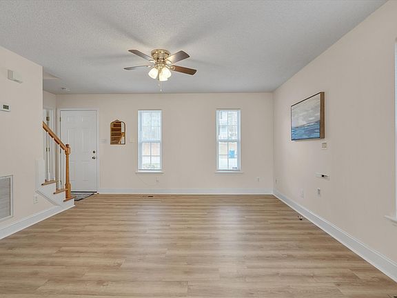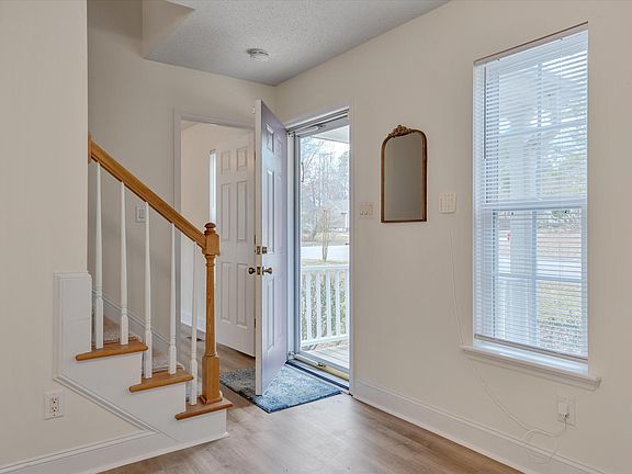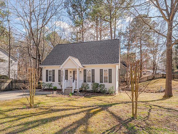 Don't miss this charming Greysons Green cottage, beautifully refreshed with a new roof, heat pump (2023), fresh paint, new flooring, and a brand-new electric range. This inviting Cape Cod-style home features a main-level primary bedroom with two closets and an ensuite bath with a tub/shower combo. The open-concept living and dining area offers seamless access to the kitchen, where you'll find a convenient half bath and tucked-away laundry room. Upstairs, two spacious bedrooms share a well-appointed hall bathroom. Step outside to a wooded, tranquil backyard, where a meandering wet-weather creek and lush greenery await your personal touch. The low-maintenance vinyl siding ensures easy upkeep, and the home comes complete with a refrigerator, washer, and dryer. Enjoy access to the neighborhood pool and a prime location just 15 minutes from downtown Durham, RTP, and RDU.